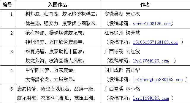 由康泰塑膠科技集團公司特(tè)邀書法(fǎ)家林嶠先生、楹聯家羅永嵩(sōng)先生發起的“為蛟龍號獻禮”對聯征集活動從2014年6月5日開始,至2014年6月14日截止,曆經10天(tiān)活動組委會通(tōng)過企業郵(yóu)箱(ktjt@sui120.com、ktsj@sui120.com)、“康泰塑膠(jiāo)集團”新浪官方微博、“康泰塑膠集團”官方微(wēi)信訂閱(yuè)號三種(zhǒng)投稿渠道共征集到有效(xiào)對聯作品373幅(fú),現經書法家林嶠先生(shēng)、特邀楹聯家(jiā)羅永嵩先生以(yǐ)及康泰集(jí)團領導組成的評審組依據題材切中、寓意內涵、平仄押韻(yùn)、節奏相應等標準對投稿作品(pǐn)進行層層篩選,本著作品充分表達“蛟龍號尖端科技實現中華強國夢;康泰生態建材實業興邦;對(duì)聯國粹(cuì)彰顯愛國情懷”的(de)重大意義與內涵,最終產生5幅入圍獎作品,現將(jiāng)名單(dān)公布如下(作品(pǐn)排名不分先後):