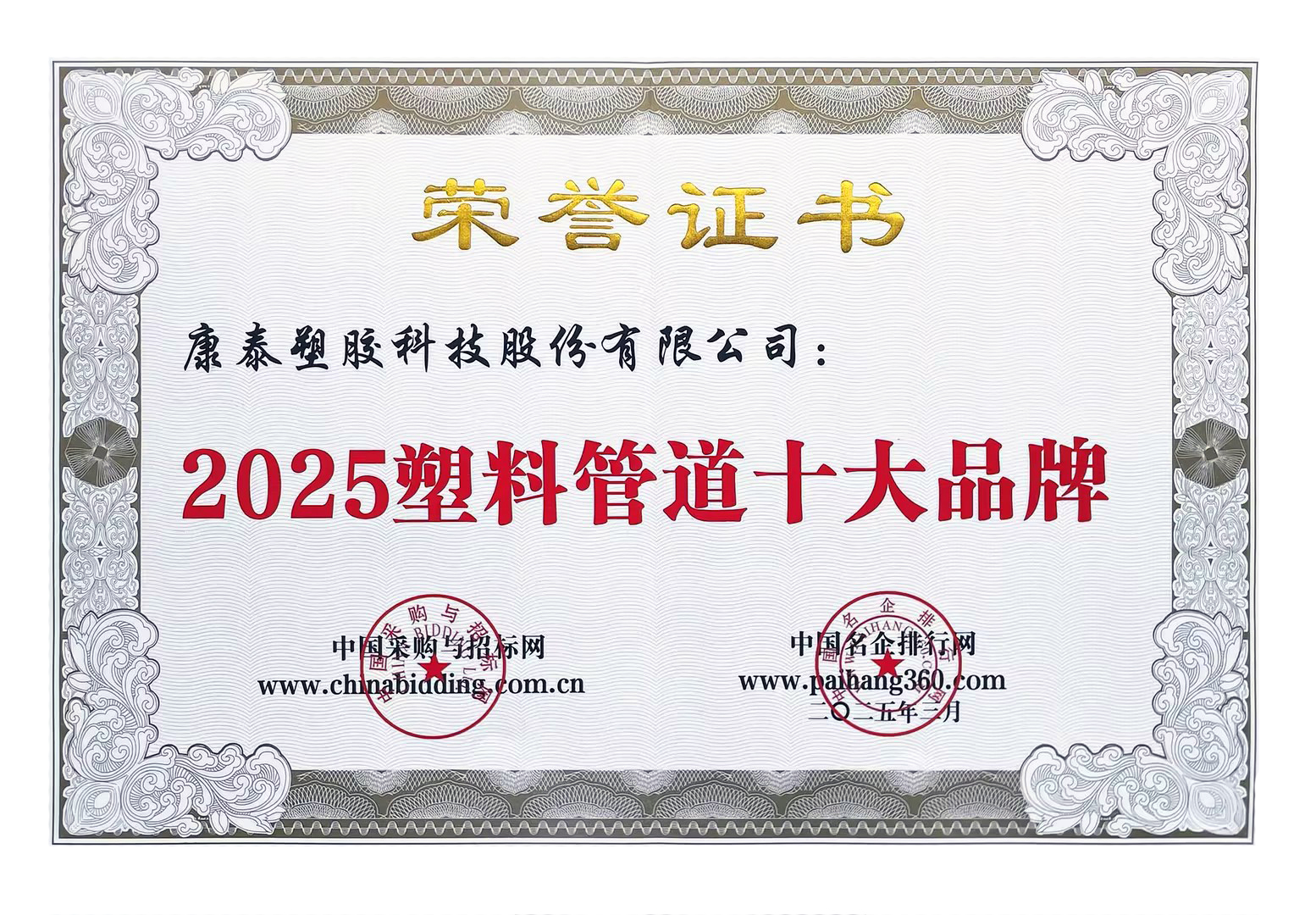 康(kāng)泰集團榮獲“2025塑料管道(dào)十(shí)大品(pǐn)牌”、“2025家裝管道十大品牌”等稱號2025/03/24 4211日(rì)前,在中國采購與招標網、中國名企排行網(wǎng)聯合主辦的中(zhōng)國塑料管道評價活動...read more -