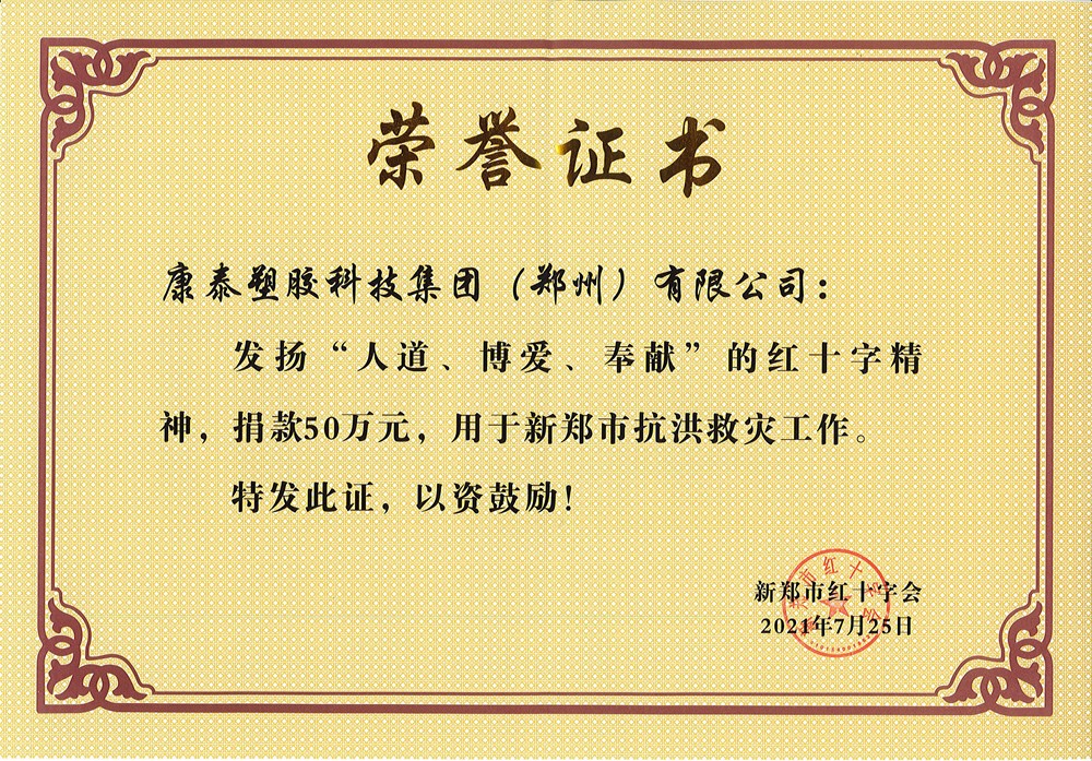 洪水無情,康泰(tài)有愛(ài)。康(kāng)泰塑(sù)膠科技集團(鄭州)有限公司心係(xì)河南(nán),與受災群眾風雨同舟,用善行義舉傳遞康泰大愛,詮釋(shì)了造福鄉鄰、回饋社會的責任擔當和大愛情懷!