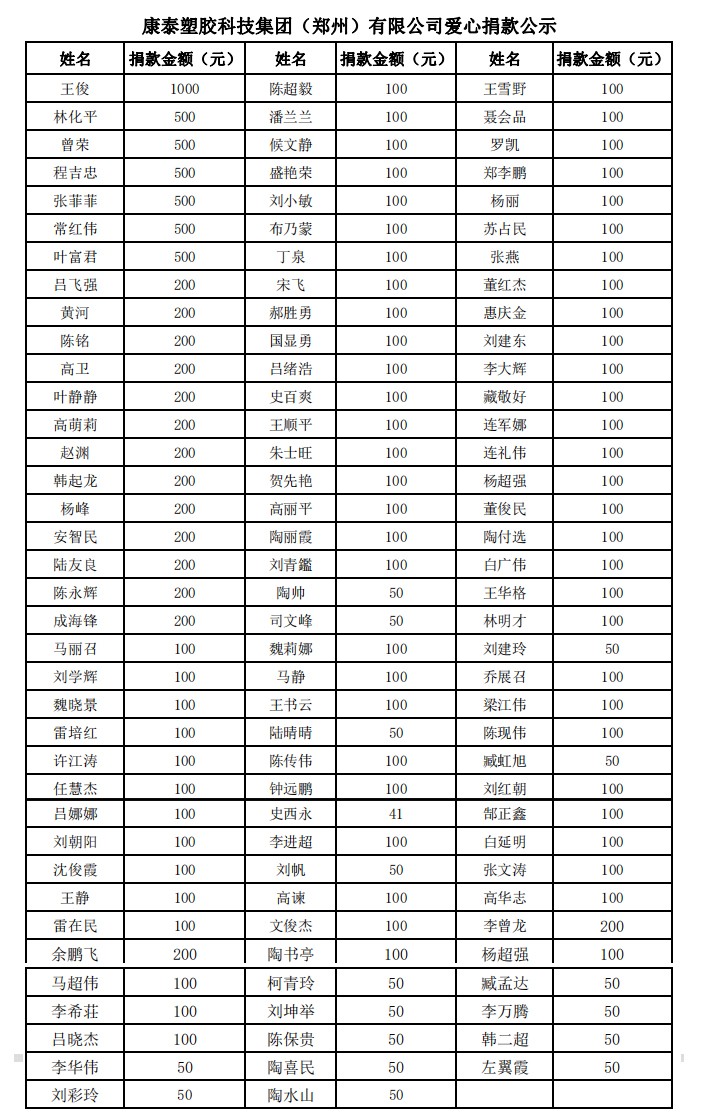 康泰塑膠科技(jì)集團(鄭州)有限公司,作為康泰集團全資子公司,自2005年成立以(yǐ)來,16年來,公司(sī)始終堅持“紮根新鄭、服務華中”的經營理念,在社會各界的關心關愛下(xià),企業各(gè)項經營事業均取得了長足的發展和進步(bù)。在(zài)此,感謝鄭州市委市(shì)政府、新鄭市委市(shì)政府,以及全體新鄭人民的支持和關心。雖然,鄭州子公司也在(zài)此(cǐ)次洪災中遭受了不同程度的損失,但是,鄭州子公(gōng)司對(duì)新鄭人民的受災感同(tóng)身受,在自身受原材料價格暴漲,企業經(jīng)營麵臨(lín)挑戰(zhàn)的情況下,依然積極履行社(shè)會責任,為(wéi)河南抗洪救災略盡綿薄之(zhī)力。公司全體員工也自發捐款,點點愛心,匯聚成河,無私助人,溫暖真情(qíng)。共同祝願河南(nán)人民早日恢複正(zhèng)常生產生活,文化河南,壯美中原。