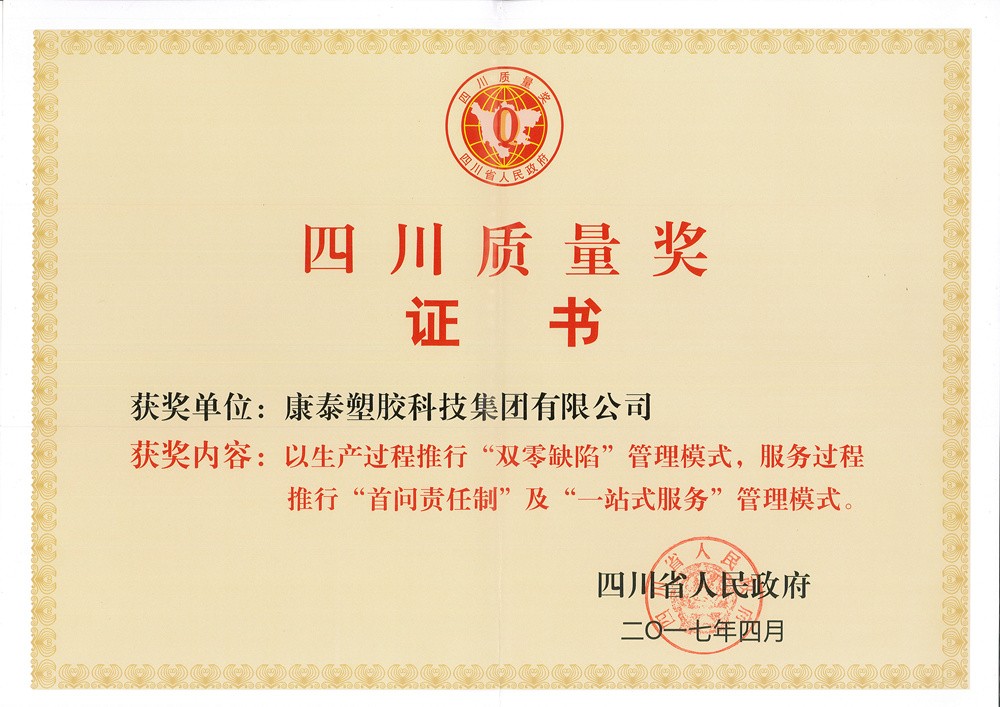 作為“四川質(zhì)量獎”的獲得者,康泰塑(sù)膠科技集團從創立以來,一直致力(lì)於對產品的研發升級和(hé)質量把(bǎ)控,不斷滿足客(kè)戶的需(xū)求。在康泰,公司建立了(le)一(yī)整套質量管(guǎn)控(kòng)體係,以“圍繞全球顧客、不斷改善,追(zhuī)求產品零缺陷”的質量方針,貫徹“產品如人品”的質量理念(niàn),全麵覆蓋(gài)ISO9001、ISO14001、OHSAS18001三體係,實施全(quán)員、全麵質量管理(lǐ),通過導入PDCA循環管理和QCC體係,嚴格質檢(jiǎn)把控。“堅持不合格原料不進廠(chǎng)”,從(cóng)源頭杜絕不合格產(chǎn)品的出現;“堅持不合格的產品不出廠”,從生產流程上杜絕不合格(gé)產品的出(chū)現(xiàn),確保產品各項(xiàng)質量指標(biāo)均達到或優於(yú)國(guó)家標準,讓用戶滿意。
