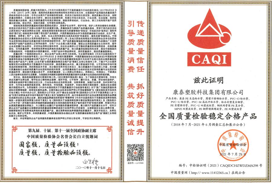 近日,康泰榮獲由中國質量檢驗協會頒發的“全國塑料(liào)管道行業質量領先品牌”、“全國塑料管道行(háng)業質量領先企業”、“全國質量(liàng)檢驗穩定合格產(chǎn)品”稱號。