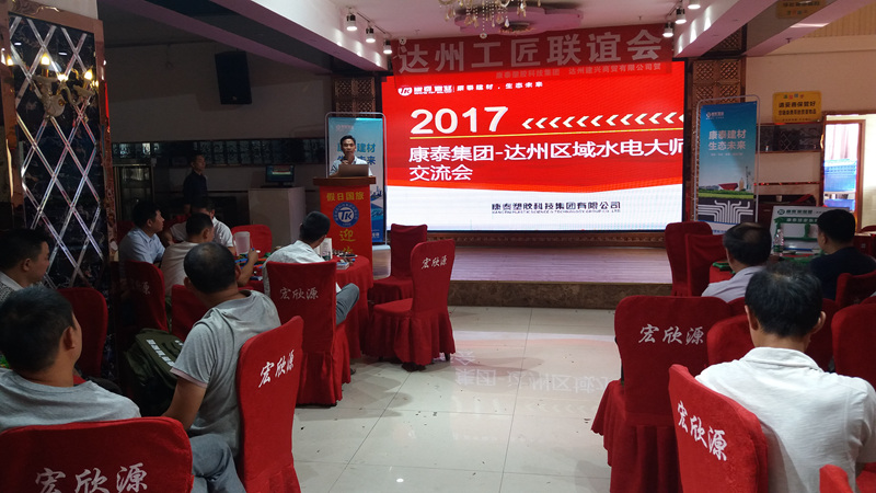 6月28日下午,康泰家裝水工(gōng)聯誼會在達州南城宏欣源酒店召開。達州區域水電工、重點經銷商等40餘人參加了本次會議。康泰零售家裝事業(yè)部(bù)部長趙(zhào)謙參加會議,並從企業實力、產(chǎn)品係列、五心管家、小康師傅等方麵闡述了(le)康泰零售家裝理念和服務體係。