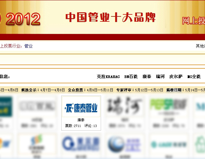圖(tú)為(wéi)康泰塑膠科技集團獲2012年中國管業(yè)十大品牌評選網頁