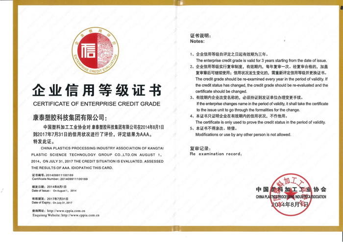 本報訊 在中國塑料加工工(gōng)業(yè)協會2014-2017年度(dù)企(qǐ)業信用等(děng)級評級活動中,經中國塑料加(jiā)工工(gōng)業協會審核(hé)批準(zhǔn),康泰集團在信用狀況進行了評價,獲(huò)得(dé)了AAA級榮譽(yù)證書。公司榮獲此項(xiàng)殊榮,是公司始終堅持“立足誠信,科學(xué)管理”的經營理念所取得的(de)成果。
