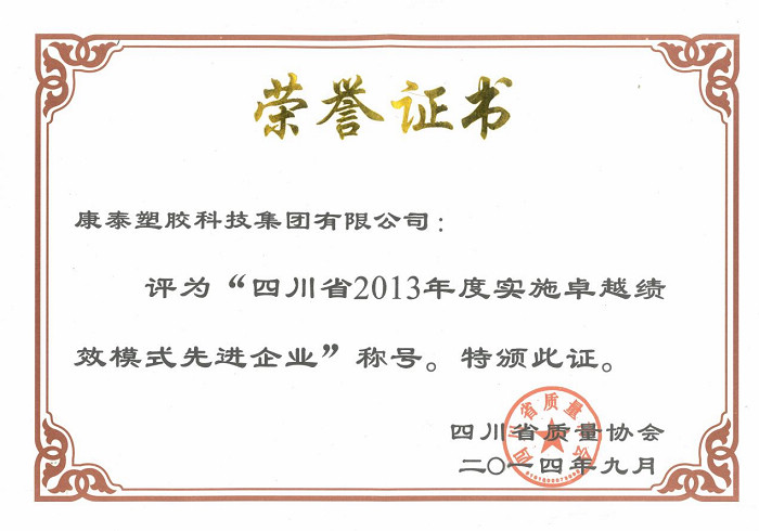 2014年9月4日,由四川省質量協會舉辦的“四川省2014年(nián)追求卓越”大會在成都金牛山莊舉行。康泰集團質量(liàng)中心總監徐(xú)水平代表公司參加會議。會議總結了2013年度四川省開創實施卓越績效管理模式先進(jìn)企業工(gōng)作(zuò)的成績,表彰了(le)2013年度榮獲四川省實(shí)施卓越(yuè)績效管理模式先進企業以及特別獎企業。康泰集團榮獲“四川省2013年度實施卓越績(jì)效模式先進企業獎”和“四(sì)川省2013年度實施卓越績效模式先進企業(yè)特別獎”。