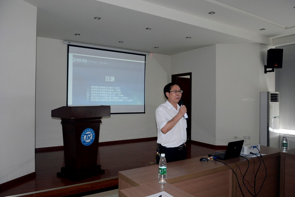 研發總監張雙全重點推介了康泰的海綿城市係統和康泰(tài)獨家研發、國內首創的MPVE®係統。講解中(zhōng),張(zhāng)總從設計理念、開發背景、技術特(tè)點、產品原(yuán)料、生產設備安裝操作、性能對比、實驗分析、應用領域、工程案例應用等方麵分別作了詳實介紹。同時介紹了已經取得的專利成果,闡述了以市場(chǎng)需求(qiú)、國家(jiā)政策和先進技術(shù)為導向,生產一代、研(yán)發一代、設計一(yī)代,內部實行產品標準化與技術、工藝配方創新的研發理念。
