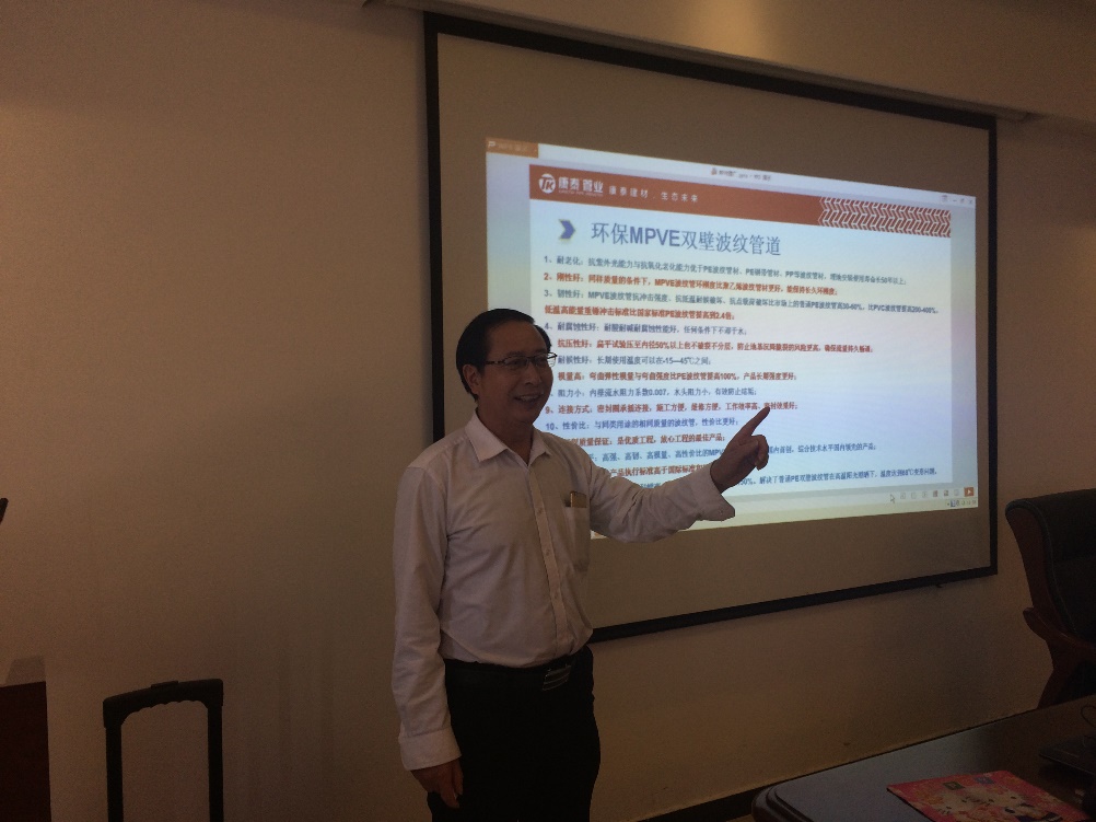 隨後,技術總監張雙全從產品的原料配方、性能參數、規格型號、產品優勢、配(pèi)套產品、安裝使用、工程案例等多方麵詳細(xì)介紹了MPVE®雙壁波(bō)紋管道係(xì)列產品並進行了現場(chǎng)技術交流。在座的領導、專家、設計師們暢所欲言,提出了許多寶貴的意見和(hé)建議,對康泰產品給(gěi)予肯定和讚譽。