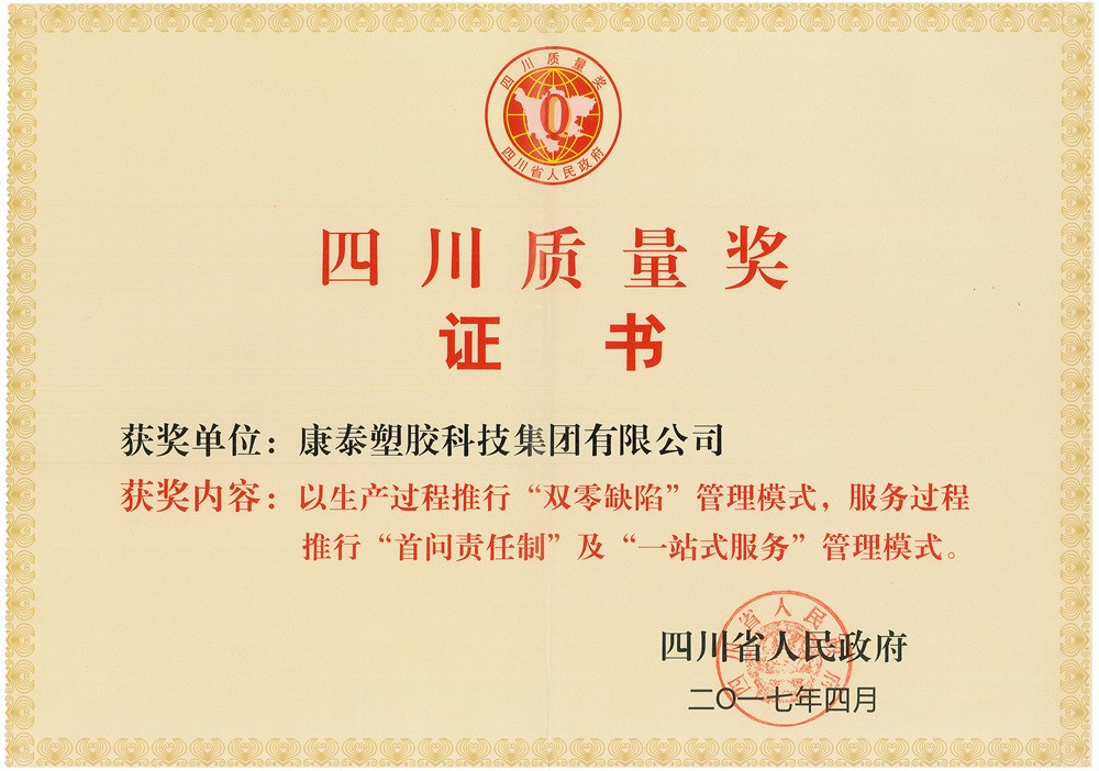 圖為第四屆四川質量獎(jiǎng)證書