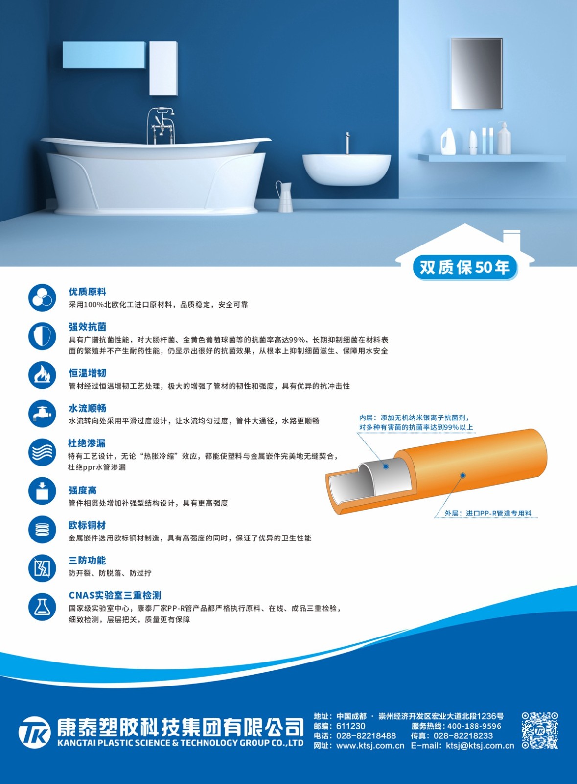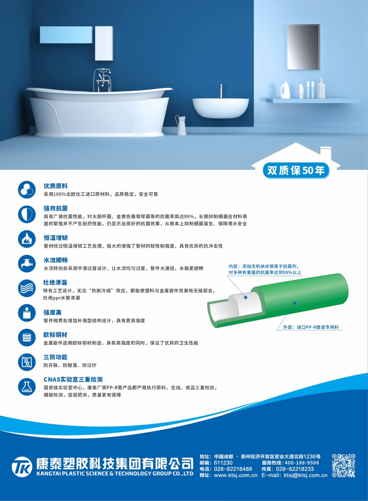 康泰PPR瓷芯抗菌管與國際頂級原材料供應商北歐化⼯⻓期合作,100%北歐化⼯進(jìn)⼝原材 料,從源頭上確保產品質量(liàng),確保家庭⽤⽔的安全(quán)健康。