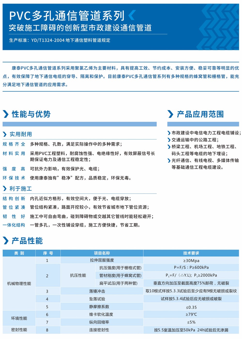 PVC多孔通(tōng)信管道用PVC多孔管製(zhì)作材料采用(yòng)聚氯乙烯為主,代替傳統的水(shuǐ)泥管塊,鋼管(guǎn)套管等保護套(tào),用於對地(dì)下通信電(diàn)纜的穿導、隔離和保護,具有提高工效、節約成(chéng)本、安裝方便、穩妥可靠等明顯的優點,逐步(bù)在地下通信管道中得到廣泛應用。